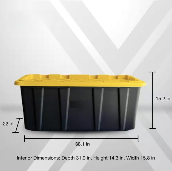 This heavy-duty 40-Gallon Tough Tote is designed to meet all your storage needs. Its recessed lid allows for effortless stacking, while the tapered design enables easy nesting when not in use. Crafted with a sturdy black base made from high-grade resin and a yellow snap lid, your items are secure and protected. Perfect for meticulous organizers seeking top-tier storage solutions, this tote features integrated slots for locking to deter unwanted access. Additionally, its unique tie-down channels make it easy to secure for hassle-free transport and compatibility with most hitch-mounted cargo carriers. The gallon size is clearly visible on both the base and the lid for easy recognition.
