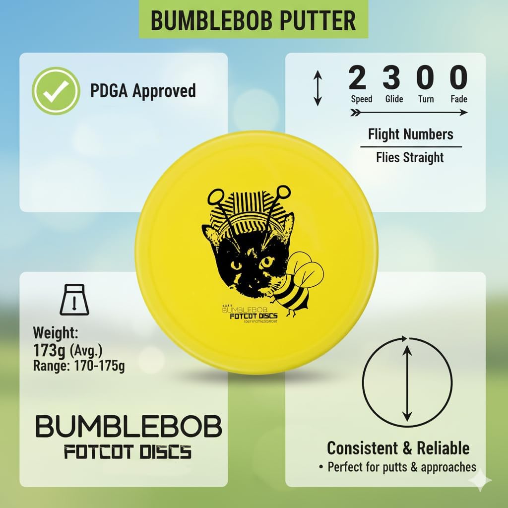 Bumble Bob Putter - Make a BeeLine To The Basket! Straight Flying, good grip, putt and approach perfection - Bob's Smiley Face will cheer you on to victory. Bob Says "I Love You, now put my face in the basket" FotCot Discs, the offical brand of cats playing disc golf. It's a simple recipe: We love Bob, and Bob Love's Disc golf, so Bob's face goes on the disc! Durable Plastic, Intricate Design, Bob loves physics after all. Available in Putter Packs of 5, 10 and 20! Start practicing effeciently ! No more throw disc, go get disc, throw disc, go get disc, stop wasting precious practice time with back and forth from the basket, more discs = more throws per hour. Having multiple of the exact same disc enhances your form exponentially - your brain and body can learn to correct small movements with the feedback of the previous throw, by disc 20 you've ironed out another small kink on your way to greatness! If you only have a coupld of discs, your body forgets what adjustments to make by the time you walk to the basket to collect the discs, each throw is like starting all over again! We've all seen the vidoes of the pros practicing-they always have a huge stack of discs so they can throw from the exact same spot many times in a row. Be a Pro with a BumbleBob Putter Pack! Bob doesn't want you to break the bank, so great deals for all on a premium putter disc for your bag.