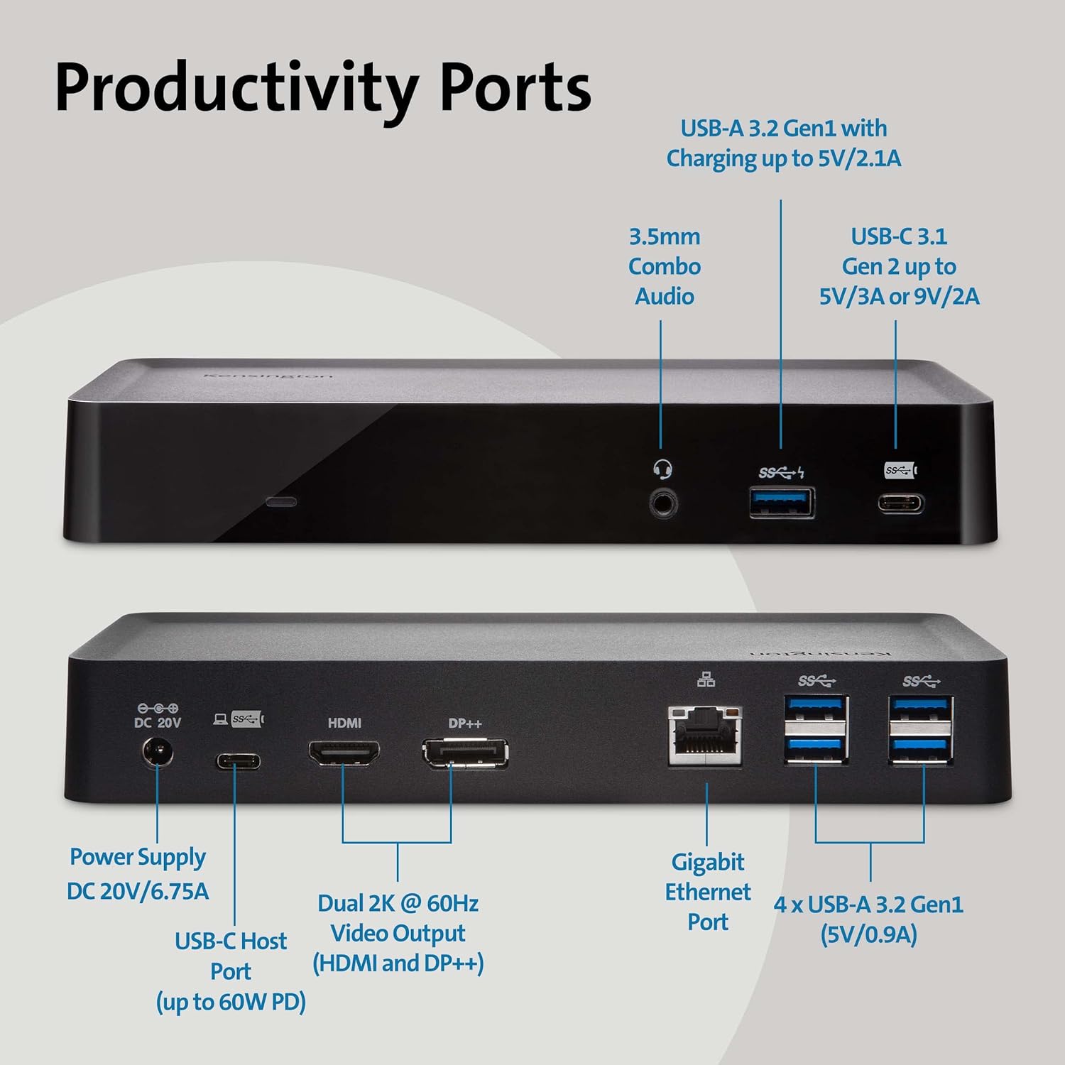 For over 35 years, Kensington has been The Professionals' Choice for desktop productivity solutions. Accommodating the latest computers with USB-C ports, while also accommodating legacy computers with USB 3. 0 ports, the SD4700P Universal USB-C and 3. 0 Docking Station is the ideal docking solution for computing s transitioning to USB-C. Frequently Asked Questions: Q: Will this dock work with any computer that has USB-C?A: Yes, all the functions will work, however for powering a laptop the laptop itself must accept Power Delivery. The SD4700P supports USB Power Delivery (version 3. 0, 5V/9V/12V/15V/20V) Profile 4, or up to 60W on a single USB-C cable. Q: Will this dock work with a laptop that has USB-C but doesn’t support Alt mode? A: Yes, the Display Link technology provides support for USB-C computers that don’t support Alt mode. Q: Will this dock work with a Thunderbolt 3 port A: Yes, Thunderbolt 3 and USB-C is mechanically the same, so all the normal functions of this dock will work when plugged into a computer’s Thunderbolt 3 port, but will only support USB-C speeds. Q: Does this dock require new driver installation on my computer? A: Yes. For Mac OS, you need to download the Display Link Driver for Mac manually from the Display Link website, display link/downloads/macOS. For Window OS, the Display Link driver should automatically install when the dock is connected to the computer the first time. If not, you need to download the Display Link Driver for Windows 7/10 display link/downloads/windows. Q: Will this dock work with a computer that has USB-A but not USB-C?A: Yes, the Display Link technology is link-aware and will work with different USB types. And, a USB-C to USB-A adapter is included. However, it will not charge a laptop over USB-A unless you purchase the optional power tips. Q: What wattage laptop will this dock power via the USB-C cable? A: As long as the laptop accepts Power Delivery via USB-C, the SD4700p will charge a laptop that requires 60 watts or less. Please check your owner’s manual or with the laptop manufacturer for specifications. Q: What cable should I use to connect my monitors? A: We recommend a direct HDMI-HDMI and a Display Port to Display Port connection to the monitors. You can use a passive HDMI to DVI adapter or cable for a DVI monitor connection. When going from Display Port to VGA, an active Display Port to VGA adapter/cable is required. Q: Can I use another USB-C cable (not from the original box) on this dock? A: We can only the Kensington USB-C cable (a 1m length cable) shipping with this dock will work. USB-C cables vary greatly between different manufacturers.