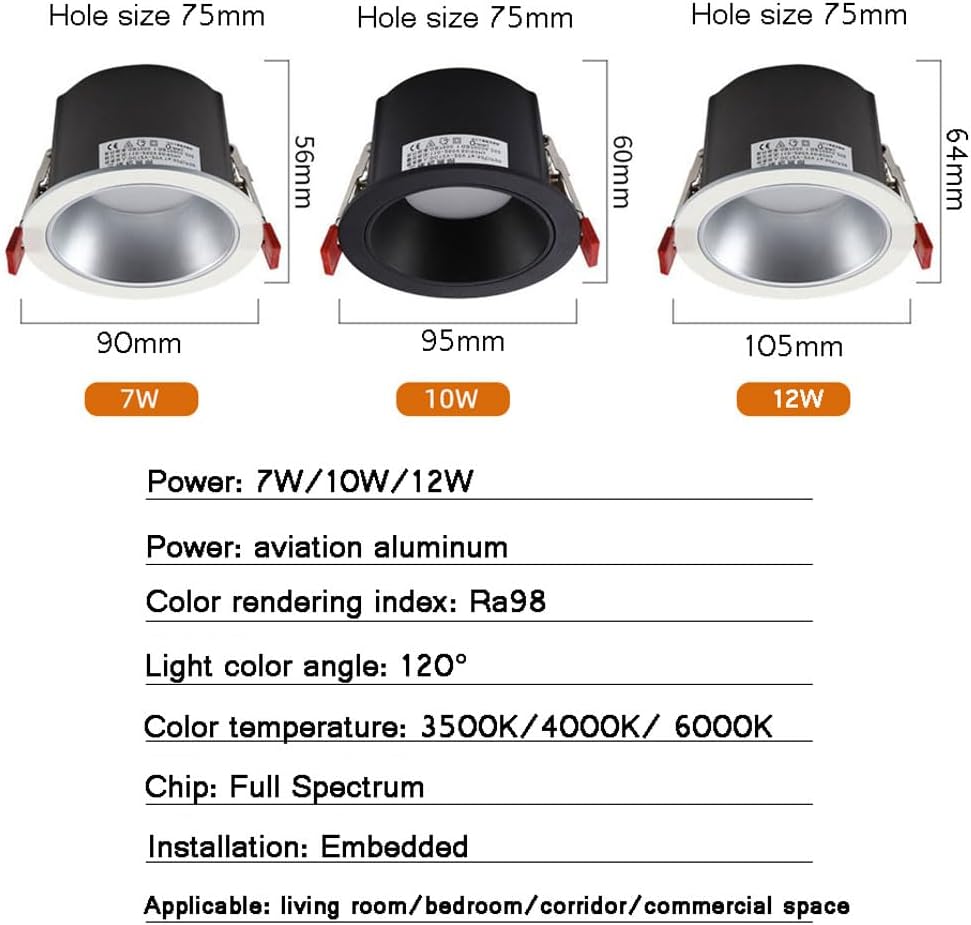Welcome to Our Shop!Packing List:4 X Led DownlightsMaterial: Aviation AluminumLight Source: Led ChipLight Color: 3500K Warm Light/4000K Neutral Light/6000K White LightPower: 7W, 10W, 12WDimensions of Lamp Body:7W:90*56Mm10W:95*60Mm12W:105*64MmBeam Angle: 120°Installation Method: EmbeddedVoltage: 90260(V)Hole Diameter: 75MmApplicable Purposes: Foyer/Toilet/Corridor/Garage/Office/Stairs/Home/Home Improvement/Commercial Photo/Wine Cabinet/Display Cabinet, Etc.Features:Energy Saving and Environmental Protection, Conducive to Recycling. Low Heat, Led Downlight.Extremely Low Heat Generation, Saving Optical Power. Lights up Instantly with No Flickering. State, Shockproof.Simple Installation, Easy to Use, and Environmental Protection.