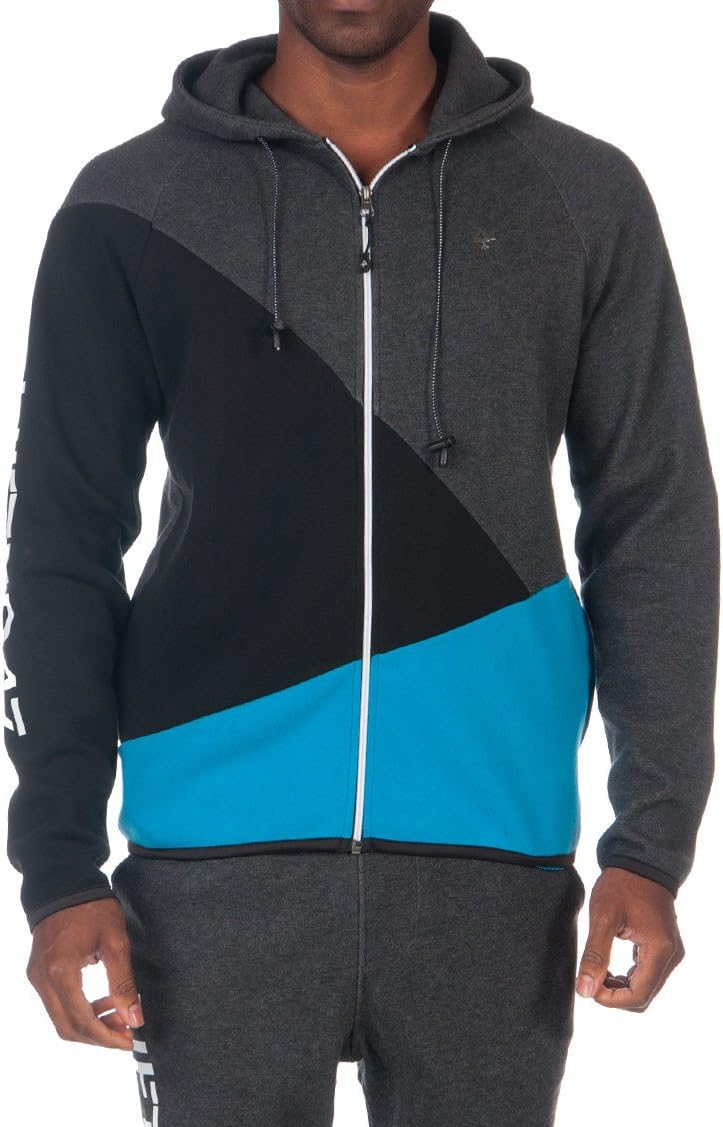 The foot strike zip hoodie is constructed of cotton polyester French terry featuring color blocked panels, metal logo detail on chest and print on right sleeve and back panel.