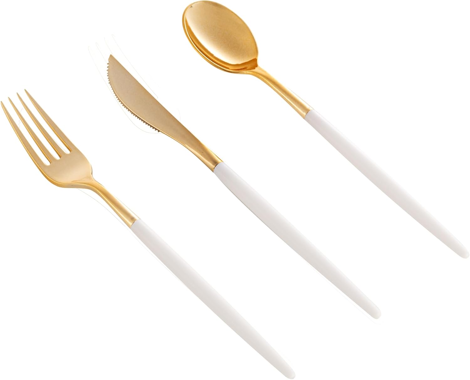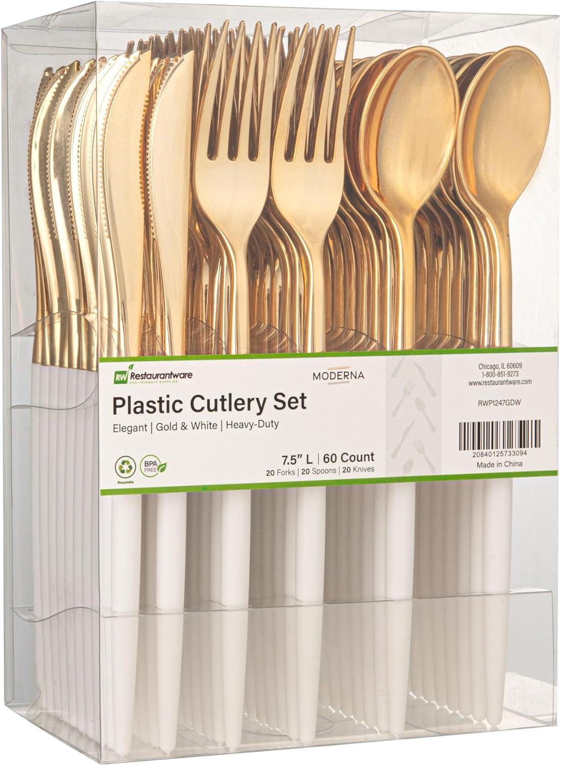 Experience the epitome of elegance with our extraordinary Moderna Gold Plastic Cutlery Sets. These meticulously curated cutlery sets comprise knives, forks, and spoons crafted from premium polystyrene plastic, ensuring durability and refinement. The reinforced white handle design of these gold plastic utensils ensures their strength, making them perfectly suited for indulging in hard foods. The sleek gold finish of these plastic flatware sets adds a touch of sophistication to your table decor, effortlessly enhancing its visual appeal. This durable utensil set withstand temperatures up to 167F. With 20 forks, 20 knives, and 20 spoons included, these sets provide an abundant supply of utensils for your large events. Embrace convenience with these disposable flatware sets, allowing for swift disposal after your gatherings, ensuring a streamlined cleanup process. Each plastic cutlery piece measures 7.5 inches long to maneuver foods easily. Shipped in a 500 count box.