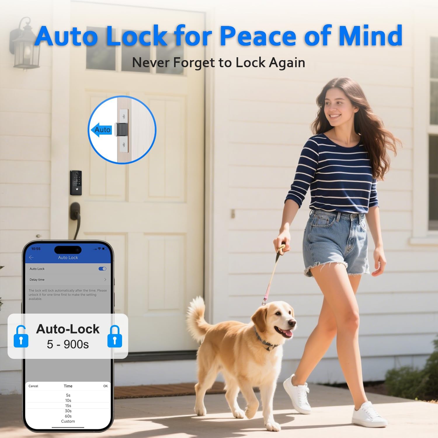 Upgrade your home security with this advanced smart keyless entry door lock. Designed for modern homes and rental properties, this smart lock combines fingerprint recognition, Bluetooth app control, keypad passcodes, IC card access, and mechanical key backup to provide flexible and secure entry options. The intuitive mobile app allows you to manage access anytime by creating temporary passcodes or one-time codes for guests, cleaners, or deliveries. With the built-in auto lock feature and durable deadbolt construction, you can enjoy enhanced home security and peace of mind. Perfect for front doors, apartments, Airbnb rentals, and offices, this smart door lock is easy to install and fits most standard US doors without complicated tools. Experience convenient keyless living and smarter access control for your home.