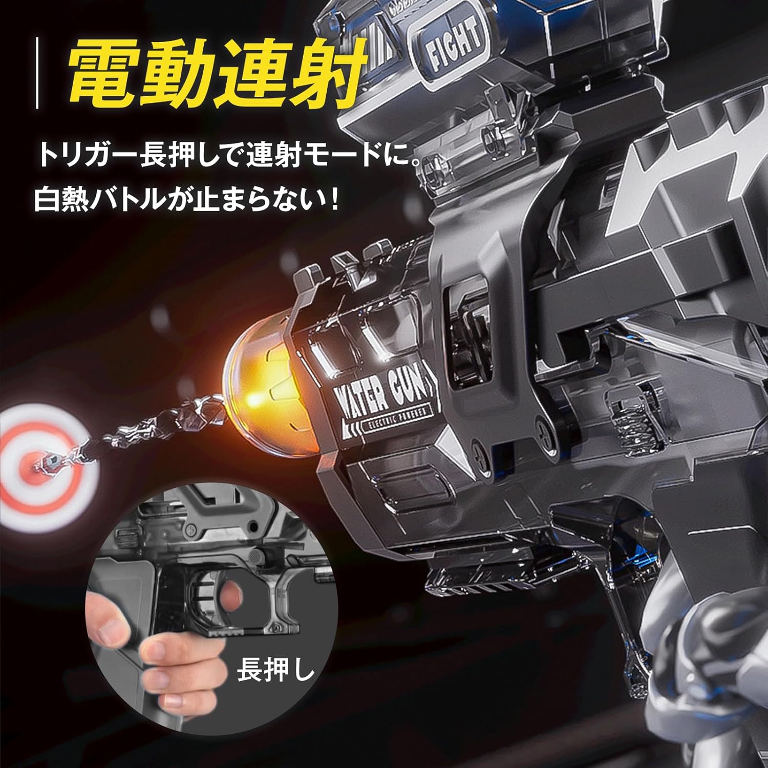 ■ Electric water gun perfect for summer water play. ■ The muzzle comes with a light that illuminates each time you shoot. - Can be enjoyed in a wide range of locations at approx. 26.2 - 32.8 ft ■ Comes with a continuous fire function that allows you to battle in incandescent water. ■ Includes large capacity water tank ■ USB rechargeable, no need to replace batteries. Product Contents: Electric water gun. Color: Blue/Black Size: Approx. 12.6 x 4.4 x 13.2 inches (31.8 x 11.3 x 33.Weight: Approx. 15.9 oz (439 g). Material: Plastic. Batteries: Lithium-ion battery. Recommended Age: 6 years and up. Precautions for Use: Please refrain from modifications, other than its intended purpose, strong impacts, etc. Specifications may change without prior notice depending on the arrival period. Depending on your display settings, the color of the actual product may differ slightly from the images. There may be stains or damages due to overseas imports. Please purchase with agreement. ○